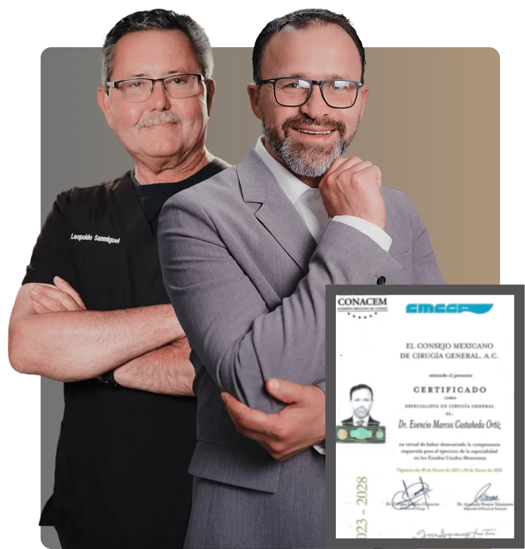 Our chief bariatric surgeon, Dr. Castañeda, is a board-certified expert in laparoscopic procedures with over 5,000 successful weight-loss surgeries. Overseeing every procedure is Dr. Sanmiguel, our chief of anesthesia and founder, who brings more than 30 years of experience and has safely managed over 15,000 cases.